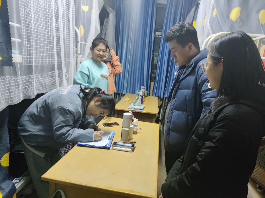 在检查中每间寝室状况都不相同,绝大部分寝室在寝室文化建设、个人物品的摆放等都能够尽可能地充分利用空间进行合理布置,形成了各自的寝室文化特色。但仍有小部分寝室存在物品摆放杂乱、不够整洁,外出不拔插头,贵重物品随意乱放,没有防盗意识的情况存在。在检查过程中,老师们告诫大家一定要整理个人卫生,及时打扫宿舍、注意用电安全、财务安全和外出的安全,对未归寝的同学的去向仔细询问,并要求辅导员立刻与未归寝同学取得联系,获知去向。对部分不合格寝室,提出了具体整改要求,叮嘱大家要妥善保管好自己的贵重物品,学会合理安排在校的学习和生活,注意内务卫生。