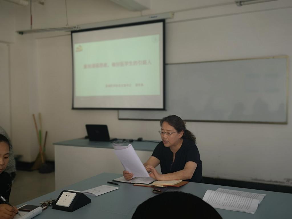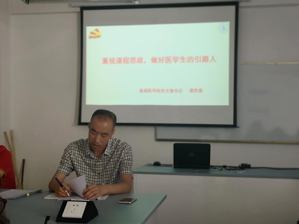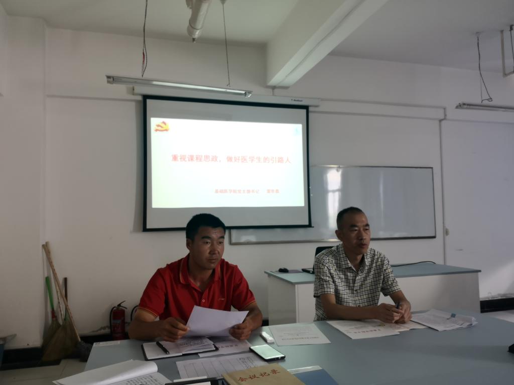 2019年6月18日上午,基础医学院召开了全体党员和教研室主任参加的支部扩大会议,支部书记、办公室主任雷世鑫主持会议,会上田金玉主任宣读、学习了甘医党发【2019】57号《关于印发甘肃医学院推进思政课程和课程思政建设实施方案的通知》文件,并安排了期末教学工作。支部书记雷世鑫做了题为《重视课程思政,做好医学生的引路人》的专题报告,从“课程思政”的现状剖析;医学院校“课程思政”的重要性;“课程思政”的重要内容;“课程思政”的注意事项四个方面进行了讲解。组织委员高泽谨宣读《中共甘肃医学院委员会党支部建设标准化建设工作主要内容》,主要介绍党支部工作开展要遵从“六有”内容,即有人管、有阵地、有经费、有活动、有载体、有氛围,为党支部建设及发展提供了方向。