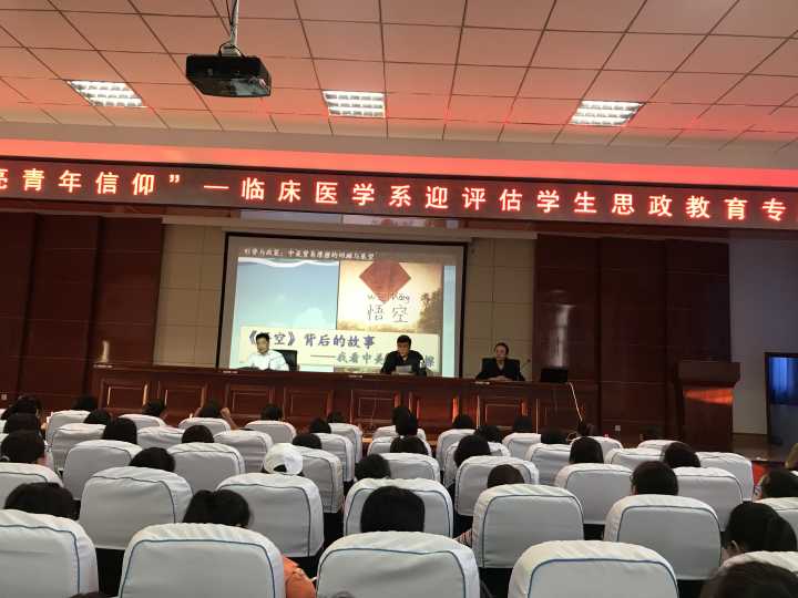 为了贯彻落实习近平总书记在学校思想政治理论课教师座谈会上的重要讲话精神,以创新性思政教育课堂助力我院教育质量验收评估工作,我系于6月5日晚在科技楼五楼学术报告厅举办关于“思政课堂点亮青年信仰”临床医学系迎评估学生思政教育专题讲座。本次讲座由临床医学系党总支主办,马克思主义学院副教授、继续教育学院副院长李超同志主讲,出席的领导老师有:临床医学系党总支副书记李宝成,临床医学系学生管理科科长周永红,临床医学系团总支书记李沛及专职辅导员。