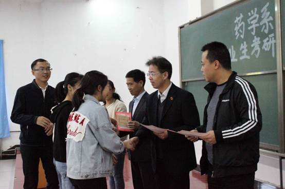 在2019年国家硕士研究生招录考试中,药学系解文静、李继纲、陶梁春和张婷四名同学分别被大理大学、西北师范大学、延边大学和郑州大学录取。为了表彰典型,激励其他在校学生,2019年5月11日,药学系学生会在1号教学楼第二大教室组织举办了“药学系2019年考研经验交流会”。药学系负责人、团总支书记、2015级年级主任、2015级本科药学班班主任及药学系300余名在校学生参加了交流会。会上,药学系为解文静、李继纲、陶梁春和张婷四名同学颁发了“学习成才奖”荣誉证书,药学系副主任赵中玮发表了热情洋溢地讲话,鼓励受到奖励的四名同学在以后的学习中百尺竿头,更进一步,为自己争得更大的成绩,为母校争得更大的荣誉;激励在校学生以解文静、李继纲、陶梁春、张婷四名同学为榜样,积极进取,勤奋学习,提高自我,为自已在本科毕业时争得进一步学习、提升、深造的机会,为自己毕业时顺利就业储备必需的知识和能力。谢文静、李继纲、陶梁春、张婷四名同学做了考研经验交流,并与在场同学进行了互动,回答了同学们有关考研的其它提问。