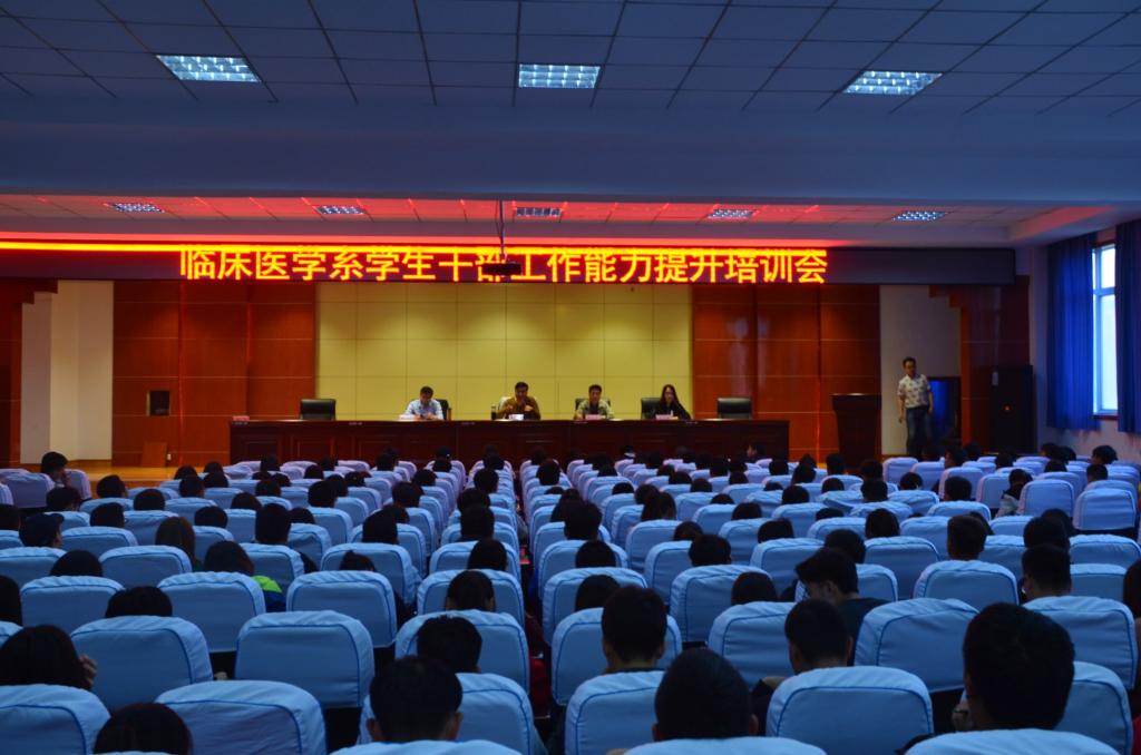 为提高临床医学系学生干部的工作效率,增强学生自我管理和自我服务的能力,提升学生干部的整体素质,进一步发挥学生干部的先锋模范带头作用,临床医学系于2019年4月23日在科技楼学术报告厅召开学生干部工作能力提升培训会,出席本次会议的有临床医学系党总支副书记李宝成,临床医学系学生科科长周永红,16、17级年级主任郭文平,15、18级年级主任石欣怡,临床医学系全体学生干部参加本次培训会议。