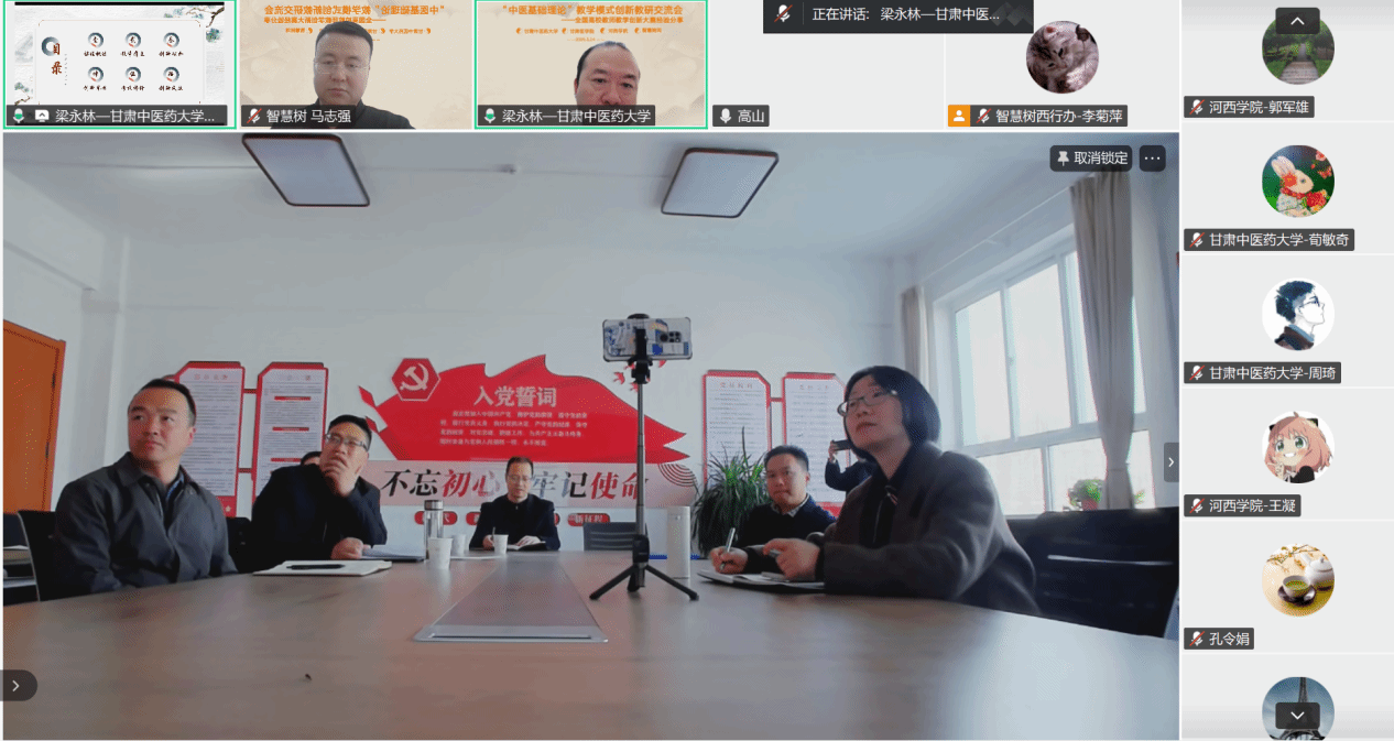 会上,甘肃中医药大学基础医学院中医基础理论教研室主任梁永林教授结合全国高校教师教学创新大赛备赛经历,围绕“以学生为中心”的教学理念,从课程内容重构、教学方法革新、评价体系优化、思政元素融入等维度,系统分享了教学模式创新的实践路径。在交流答疑环节,皇甫谧学院教师结合针灸推拿学、康复治疗学等专业教学实际,就智慧课程资源深度应用、跨校同步课堂组织、AI工具助力个性化学习等议题,与梁永林教授及智慧树平台顾问展开深入研讨。