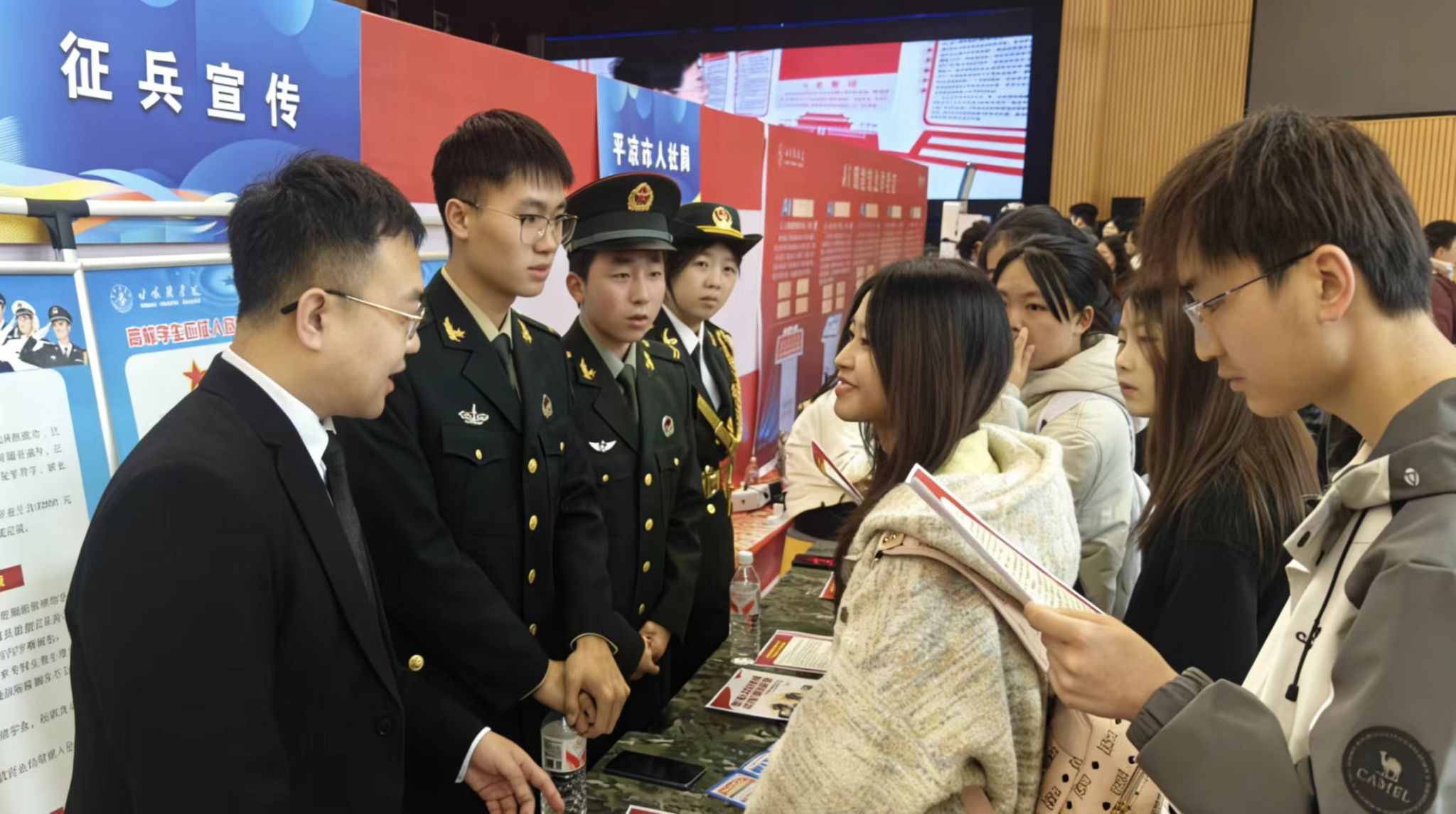 活动现场,征兵工作站老师、退役大学生士兵代表及国防新青社成员围绕应征报名条件、入伍优惠政策、退役升学就业扶持等热点问题,为同学们进行一对一解答。工作人员结合自身军旅成长经历,用生动朴实的语言、清晰详实的讲解,帮助同学们全面了解入伍流程,进一步点燃了青年学子携笔从戎、报国强军的青春热情。
