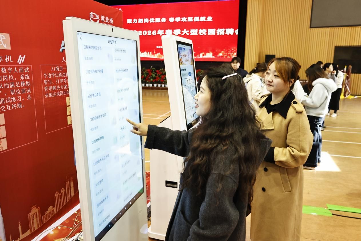 今年的招聘会现场亮点纷呈,最吸引眼球的莫过于全新亮相的AI赋能就业体验区,分别设置了咨询办理、生涯探索、模拟面试、简历制作等多个人工智能一体机,供同学们有序排队体验“智能诊断”服务。