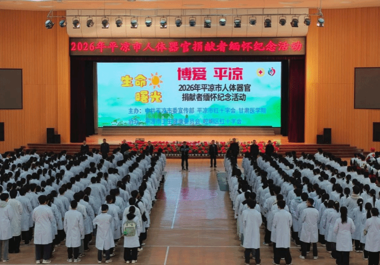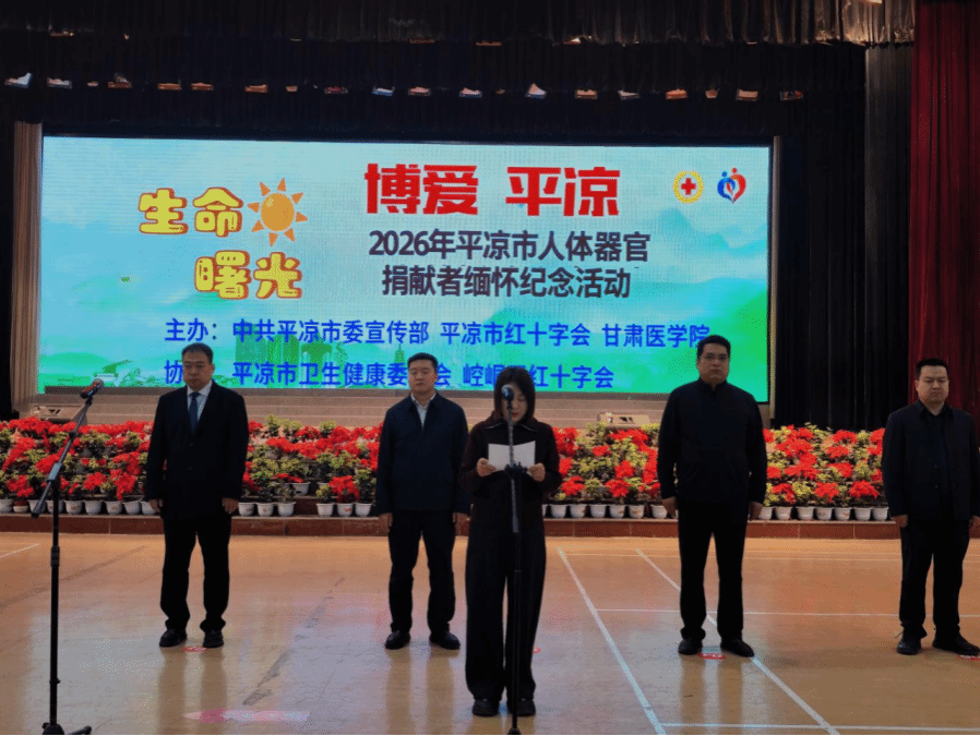 近日,由平凉市委宣传部、平凉市红十字会和我校共同主办,平凉市卫生健康委员会、崆峒区红十字会协办的“生命·曙光”2026年平凉市人体器官捐献者缅怀纪念活动在我校体育馆举行。学校党委委员、副校长刘凯,平凉市市委副秘书长张建辉出席活动并致辞,平凉市红十字会党组书记、常务副会长边疆主持活动,人体器官捐献者家属及各单位代表500余人参加活动。