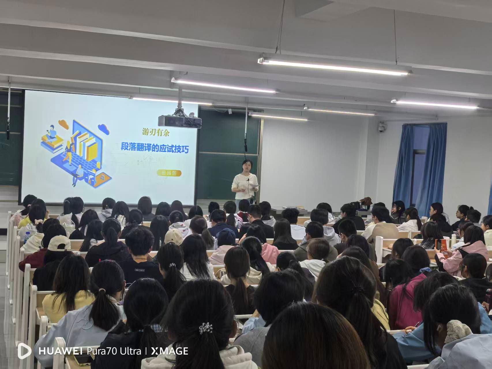 本次讲座历时40多天,重点聚焦四级翻译、写作、听力、阅读等应试模块。授课教师结合历年考试真题,深入剖析命题规律、答题技巧与评分标准,现场通过真题讲解、互动答疑等形式,针对性解决学生备考困惑,梳理高效备考思路,切实提升学生答题能力与应试信心。