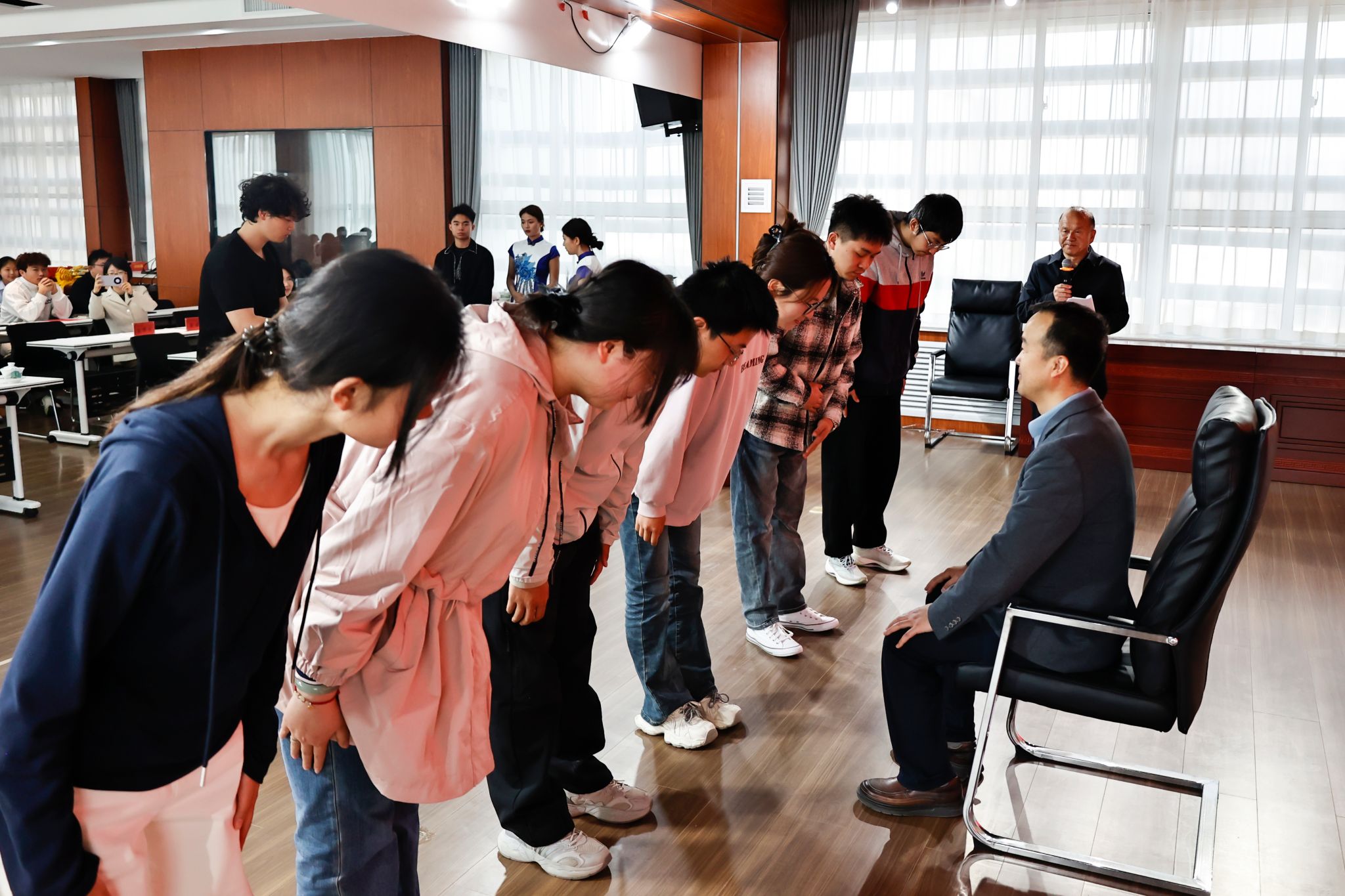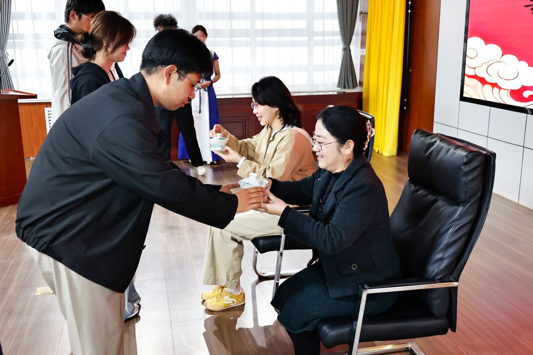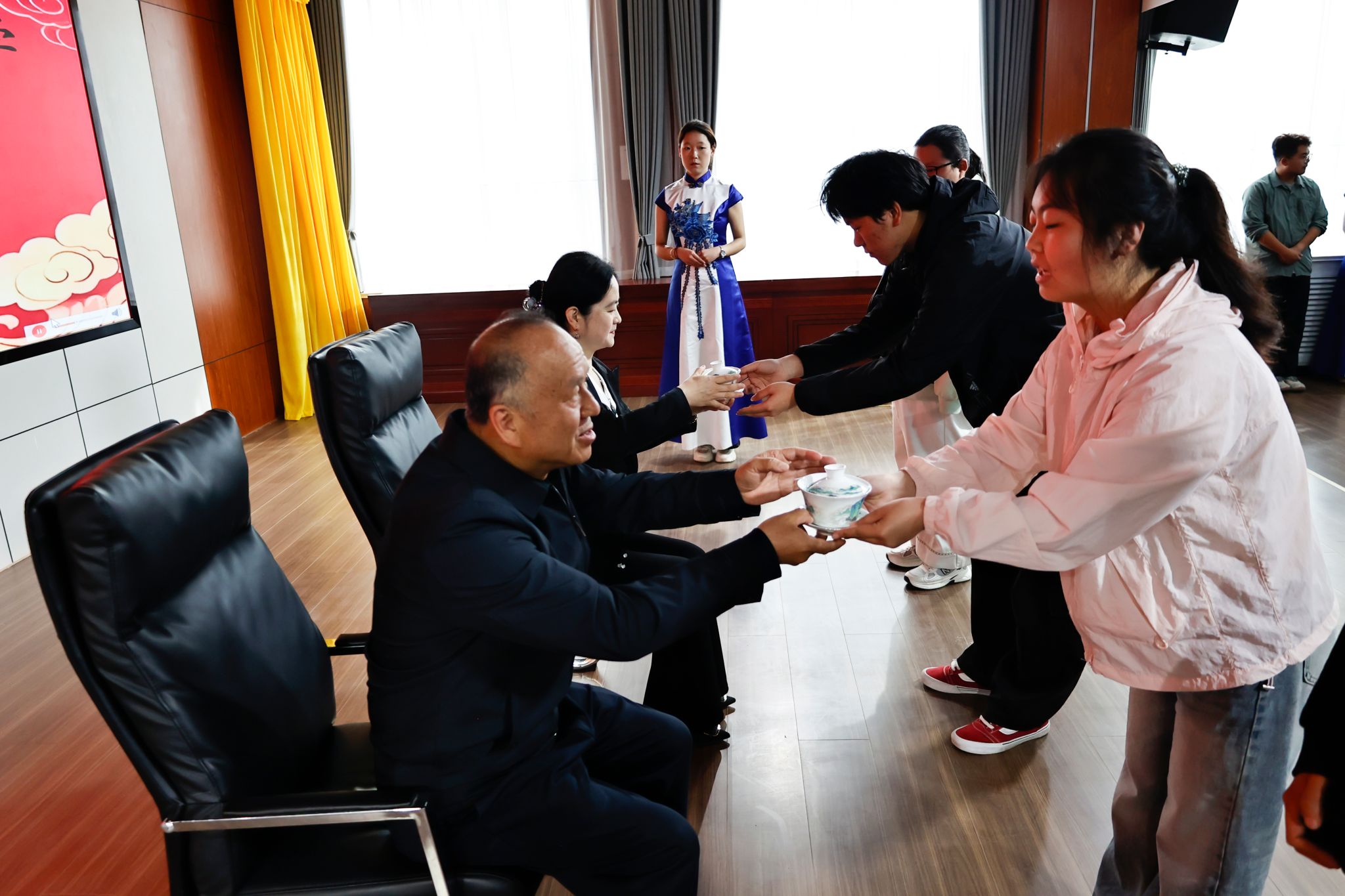 2024级针灸推拿学学生依次向导师躬身行礼、奉茶拜师。一杯清茶承载尊师之心,一礼躬身接续岐黄之脉,尽显中医师承庄重风范与学医初心。