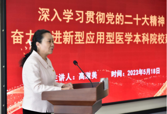5月18日下午,学院党委书记高淑美在图书馆五楼学术报告厅为师生讲授题为《深入学习贯彻党的二十大精神 奋力推进新型应用型医学本科院校建设》的主题教育专题党课。省委第八巡回指导组组长、省人大监察和司法委员会副主任委员、省人大常委会监察和司法工作委员会主任张怀仁,指导组成员、省工信厅老干部处处长王玲到会指导。学院党委副书记、副院长崔安平参加。