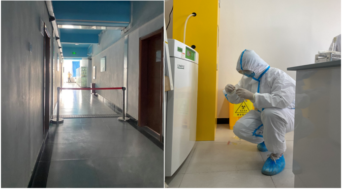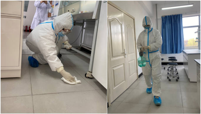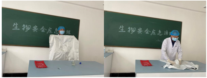 演练内容包括:1.实验室发生酒精灯引发着火处理及灭火毯的使用;2.病原生物实验室发生操作的实验容器破损及感染性物质的溢出处理。参演人员按照应急预案,对现场应急处置进行了实地演练: