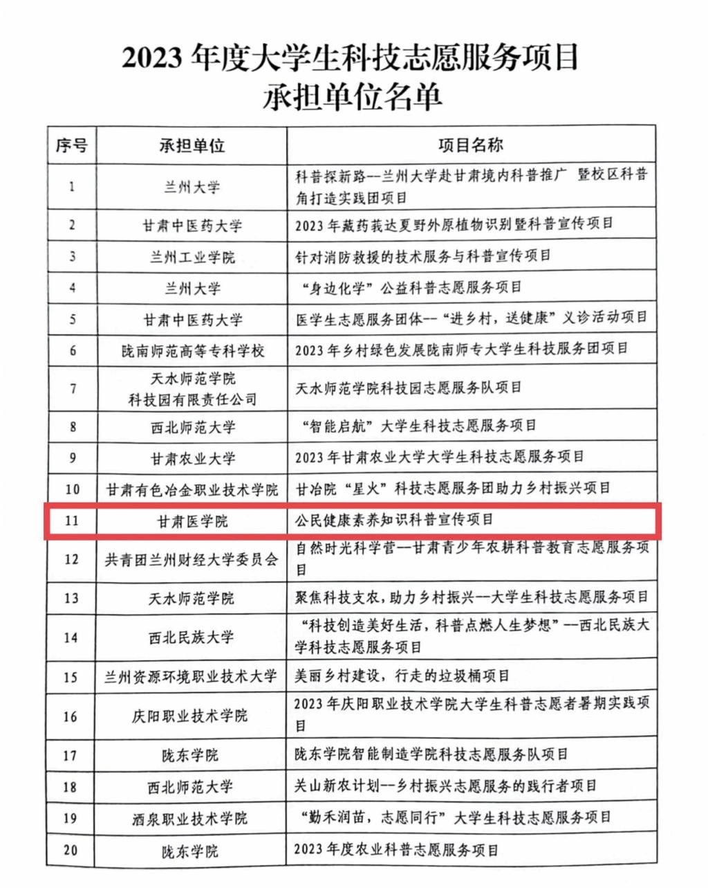 近日,甘肃省科学技术协会发布了《关于确定2023年度大学生科技志愿服务项目承担单位的通知》。经我校大学生科技志愿服务队自愿申报、材料初审、专家评审及省科协党组会议研究,确定预防医学社为公民健康素养知识科普宣传项目承担单位。