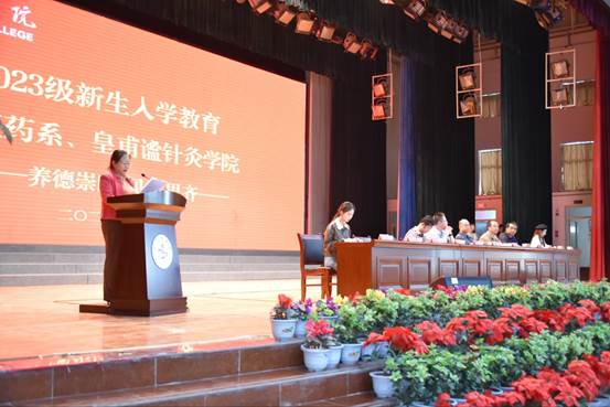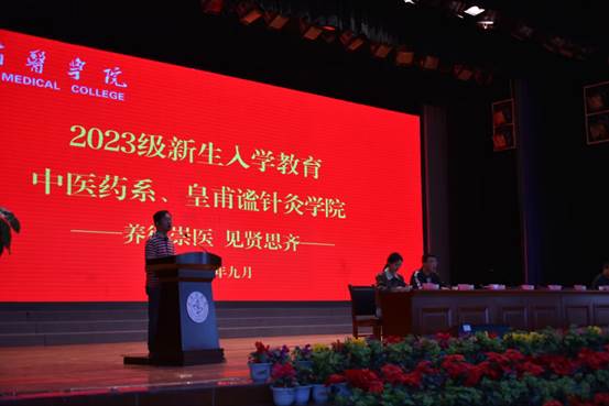 中医药系主任李莲英、皇甫谧针灸学院院长刘君奇出席会议并讲话,出席会议的还有中医药系副主任吕小旭、皇甫谧针灸学院办公室主任王利军。学生科科长柴亚强主持会议,中医药系、皇甫谧针灸学院全体班主任辅导员,全体2023级新生参加大会。