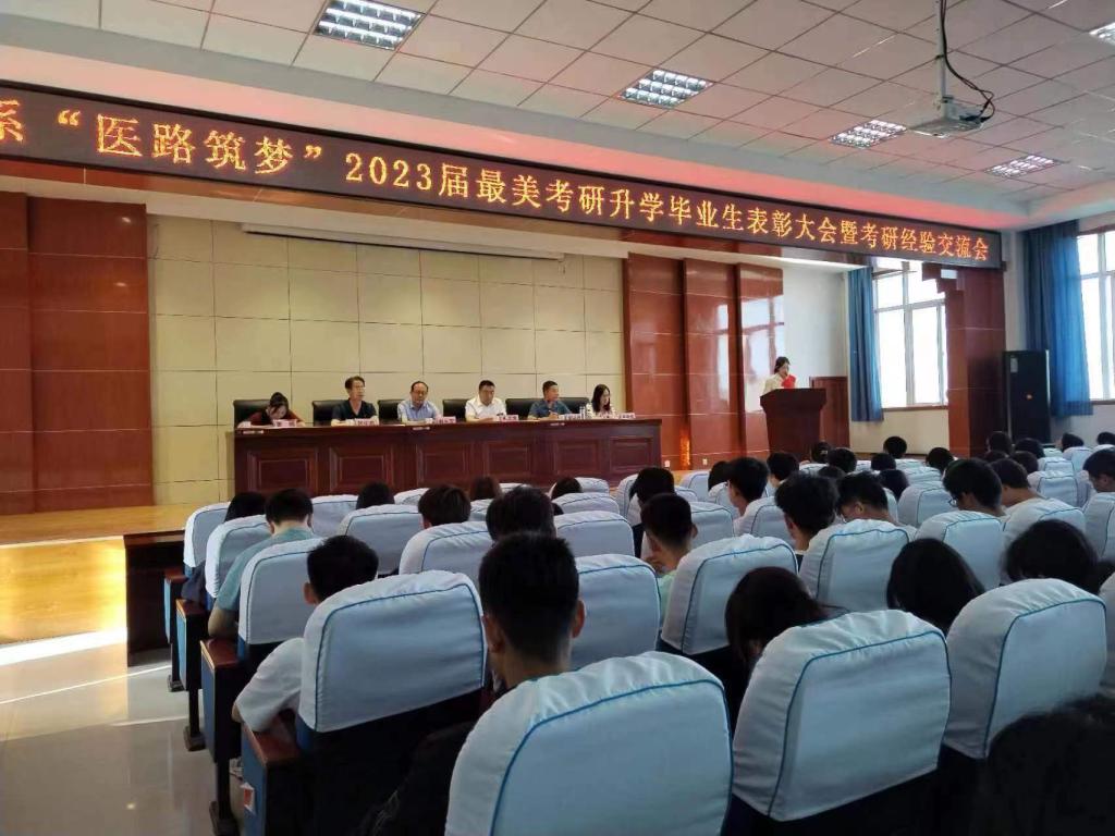 为表彰先进,树立典型,进一步培育良好学风,根据学院领导批示,受学院学生工作部和招生就业处两个部门的大力支持,药学系于6月14日晚在科技楼五楼学术报告厅隆重召开甘肃医学院药学系“医路筑梦”2023届最美考研升学毕业生表彰大会暨考研经验交流会。出席大会的有甘肃医学院招生就业处处长戴三军、甘肃医学院学生工作部部长朱天荣,药学系党总支书记、系主任赵中玮、药学系副主任董娜、药学系团总支书记李晓青,大会由药学系副主任戴兴德主持,药学系2023届毕业班全体班主任、辅导员、药学系2023年考取硕士研究生的全体同学和在校学生代表共计400余人参加会议。