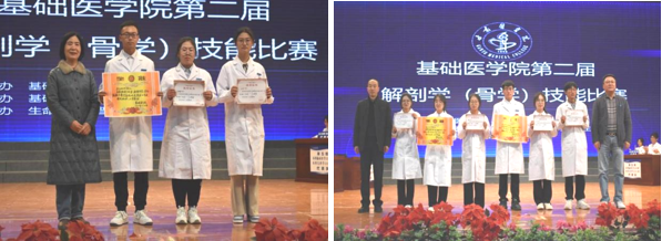 经班级初赛、学院预赛和人体解剖学教研室老师们耐心指导,共有6支代表队18名选手晋级决赛,通过“蒙眼摸骨”、“辨识结构”、“挑战风险”三个环节,考察了学生的知识储备与实践能力,增强了学生的团队意识和集体荣誉感,展现了学生崇医尚学、勇于挑战的精神风貌;中场互动环节台上台下联动,将整场比赛推向高潮,现场气氛紧张热烈。