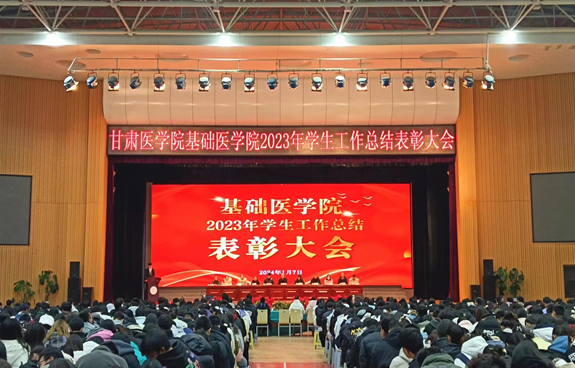 2023年,基础医学院学生工作得到了学校各级领导亲切关怀,得到了各部门的大力支持。为全面总结部门学生工作,增进对评估成果的巩固,深入推进学风建设再上台阶,让全体同学进一步明确学习目标、端正学习态度,形成学、比、赶、超的浓厚学习氛围,2024年1月7日19:30在学校体育馆隆重召开了“总结经验、巩固成果、表彰优秀、共促进步”为主题的学生工作总结表彰大会。基础医学院副院长雷世鑫教授,教务科、学生科负责人,全体班主任、辅导员以及在校学生代表共计1600余人参加了大会。