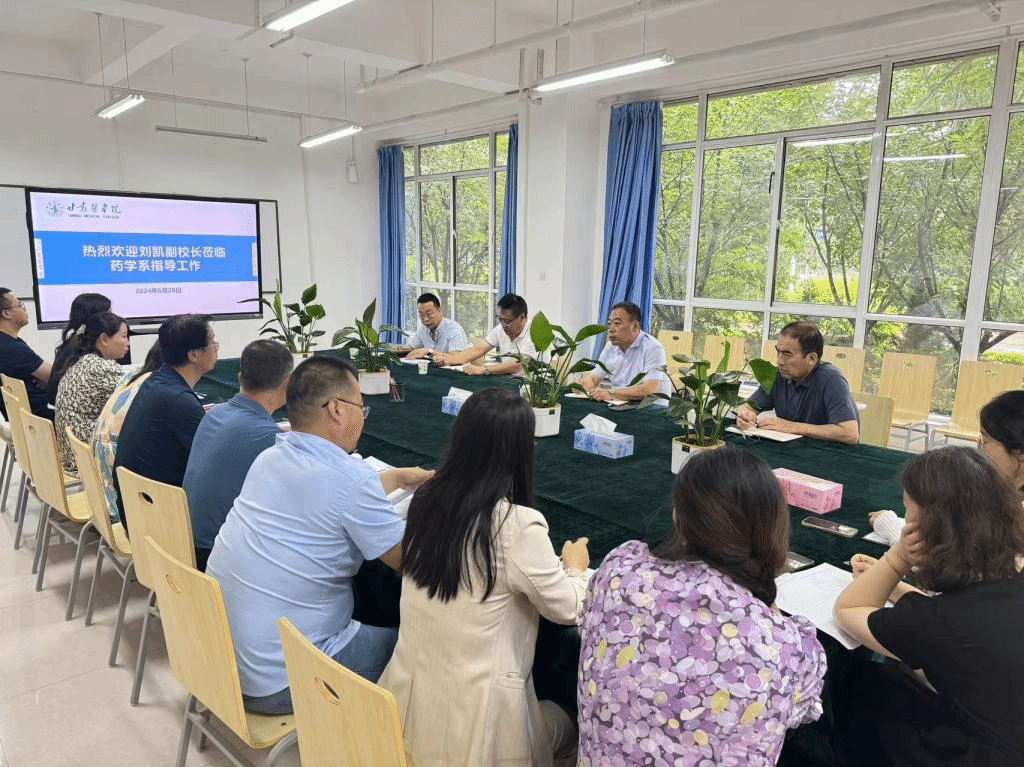 2024年6月28日下午,学校党委委员、副校长刘凯莅临药学系调研指导工作,教务处席晅处长、实践教学管理处李德双副处长、教务处教务科姚岗科长陪同调研。药学系行政人员及全体无课老师专职辅导员参加了会议,会议由药学系主任赵中玮主持。