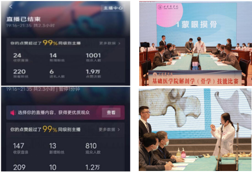 本次决赛环节分为蒙眼摸骨、辨识结构、挑战风险,综合考察学生的知识储备与实践能力。“蒙眼摸骨”环节,各参赛队的一号选手铆足干劲、争分夺秒,每支队伍激烈角逐、流畅作答,计时器、显示屏数字及每队名次不断的刷新,现场气氛活跃;“辨识结构”环节,难度远远大于预赛,数量增多,用时却不变,但选手们仍能认真辨认、冷静作答,评委老师们赞不绝口,台下更是掌声雷动,一轮高过一轮,赛场上掀起一波又一波高潮……一、二环节结束时,两个抖音直播平台的点击观看量累计已达到一千八百人,点赞数已接近三万。在短暂的中场互动过后,本次决赛的最大看点——“风险挑战”正式开始,面对不同分值的题目,各个参赛队员认真分析当前面临的形势,是稳扎稳打还是奋力一搏?场上选手剑拔弩张,场下观众屏息以待,伴随着评委老师们对每道题目的现场点评,场上场下、线上线下,所有人为之沸腾,为之激动,知识火石的碰撞与思维浪花的翻涌在本环节中展现得淋漓尽致,参赛选手们的不屈不挠、从容不迫,充分展现出我院学子的高心理素质与高知识储备。