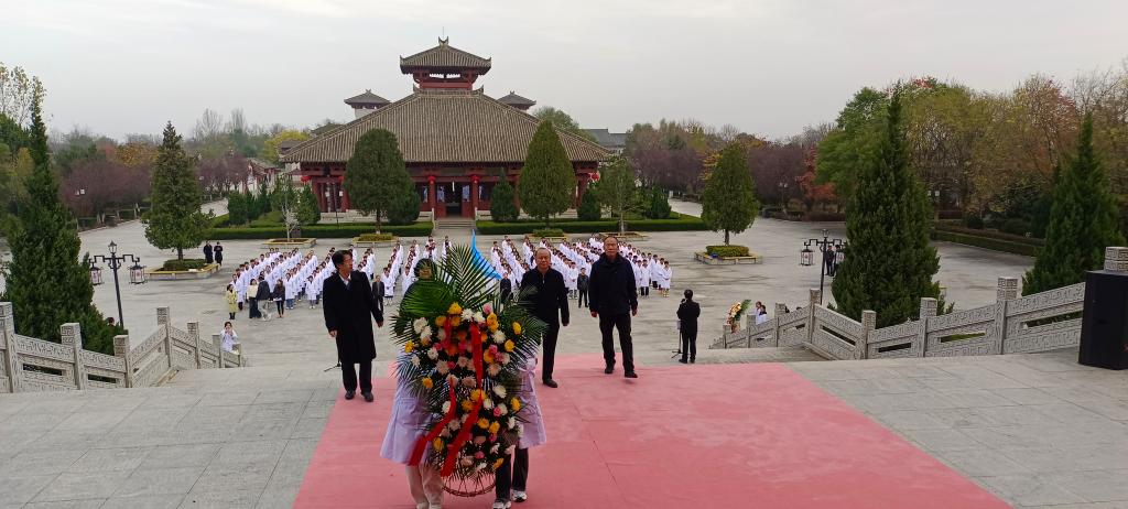 全体师生诵读了《针灸甲乙经》(节选),并向皇甫谧雕像敬献花篮。