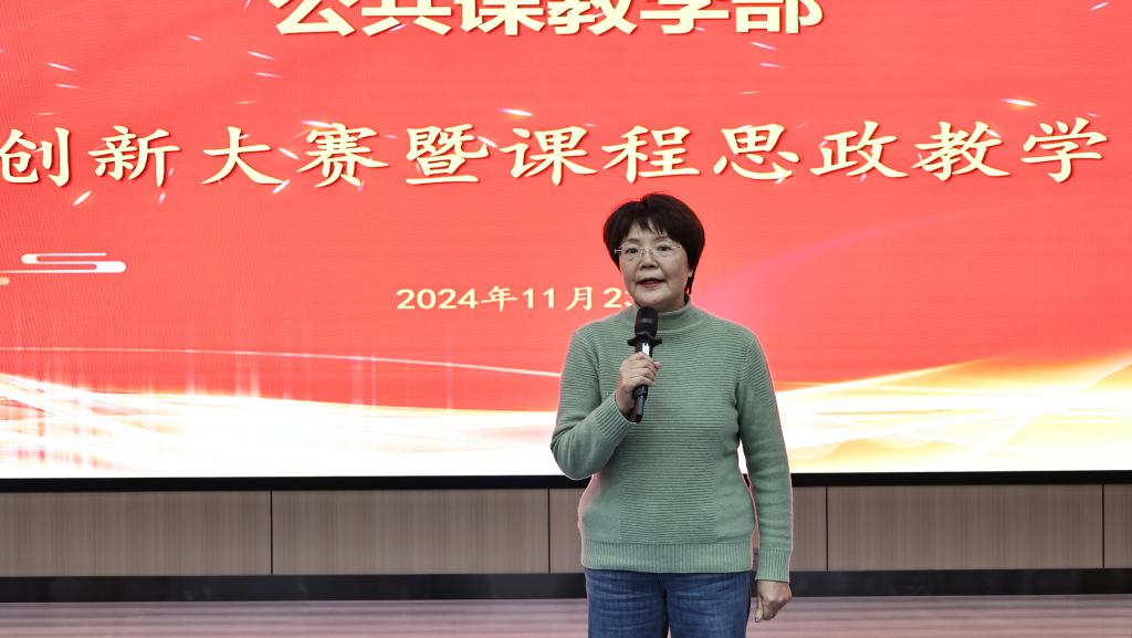 最后,公课部部长黄砚做总结讲话,她表示本次大赛充分展示了我部教师的教学水平和创新能力,也进一步推进了公课部教学创新发展和课程思政建设。公课部将以此次大赛为契机,进一步强化“立德树人”根本要求,夯实教学创新和课程思政改革基础,发挥“以赛促教、以赛促学”的榜样作用,全面提升教师的教学能力和育人水平。