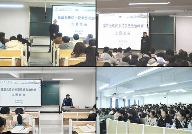 为充分发挥党建育人作用,加强对学生的思想政治引领,持续推动“时代新人铸魂工程”深入实施,基础医学院党总支书记雷世鑫,基础医学院副院长、教工党支部书记李红恩,学生党支部书记高泽谨经过集体备课,于12月6日、8日、20日、22日四个时间段,分赴各班召开思想政治教育主题班会。