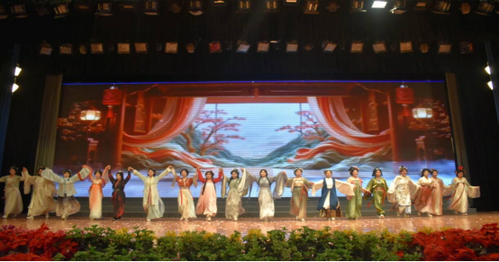 17日晚,甘肃医学院体育馆内座无虚席,超300名观众齐聚于此,共同欣赏汉服秀。活动以沉浸式场景设计搭配古典乐舞与光影特效,舞蹈《司花令》开启十二花神献瑞舞,瞬间将观众带入古风意境。模特们身着齐胸襦裙、魏晋风骨袍等十余种经典汉服形制惊艳走秀,专业解说详细介绍各朝代服饰的历史背景与文化寓意。ATP音乐协会民乐队的悠扬旋律与武术队刚劲有力的表演相得益彰,赢得现场阵阵掌声。