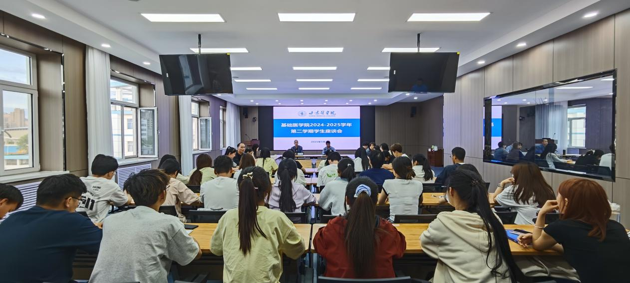 5月29日晚,基础医学院在教师发展中心召开2024-2025学年第二学期学生座谈会。学院党总支书记雷世鑫、副院长李红恩,学生科、教务科负责人及相关老师与37名学生代表进行广泛交流,助力学生成长,共谋学院发展。