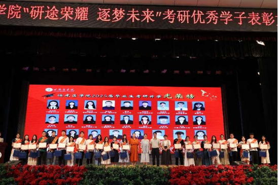 随后,刘凯副校长、张艳副校长为考研优秀班级班主任万改红、拜晶鑫老师以及10名考入复旦大学、首都医科大学、兰州大学的研究生颁发荣誉证书,其他领导也分别上台为考研学子颁奖并合影留念。