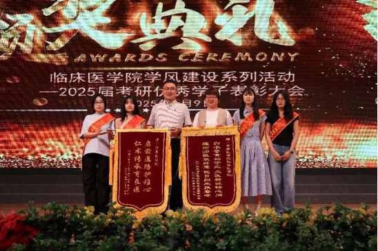 最后,临床医学专业毕业生代表、儿科专业毕业生代表向学院赠送锦旗,对学院的教育培养和老师们的悉心栽培表达感激之情。