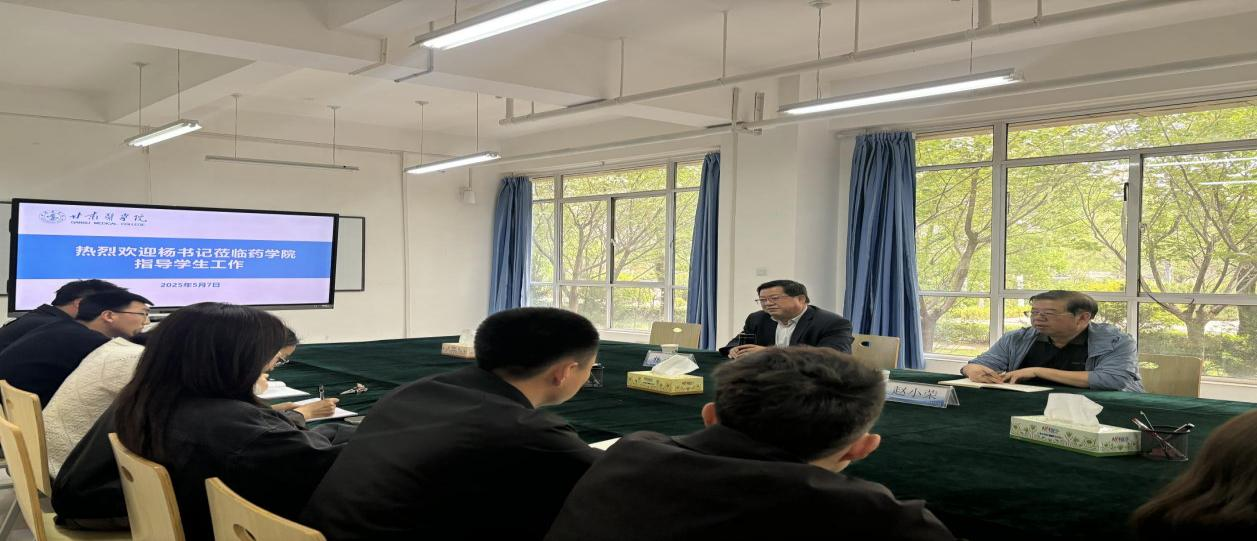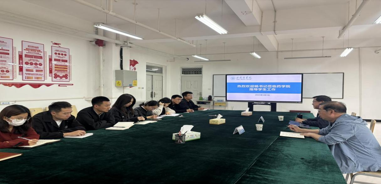 2025年5月7日,甘肃医学院杨建福书记莅临药学院开展学生指导工作,通过座谈交流等方式,深入了解辅导员工作实际困难,研讨学生管理工作路径,并就“如何与学生建立深度联系”提出指导性意见。药学院全体辅导员、班主任参会。