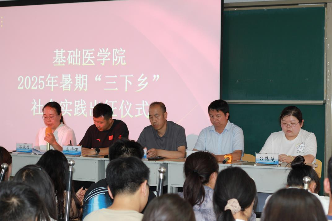 7月10日,基础医学院2025年暑期“三下乡”社会实践活动出征仪式在二号教学楼B座第八大教室举行。基础医学院党总支书记雷世鑫、副院长李红恩,学生科、办公室相关负责人、各队指导老师及全体实践队员参会,仪式由团总支书记石欣怡主持。