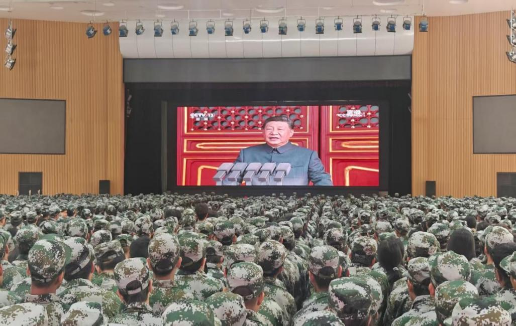 在军训期间,正逢纪念中国人民抗日战争暨世界反法西斯战争胜利80周年大会之际,基础医学院班主任和辅导员组织新生齐聚体育馆,共同观看纪念大会直播。此次观礼活动让同学们深刻感悟到今日的军训不仅是对体能与意志的锻炼,更是对红色基因的传承与担当精神的培育。