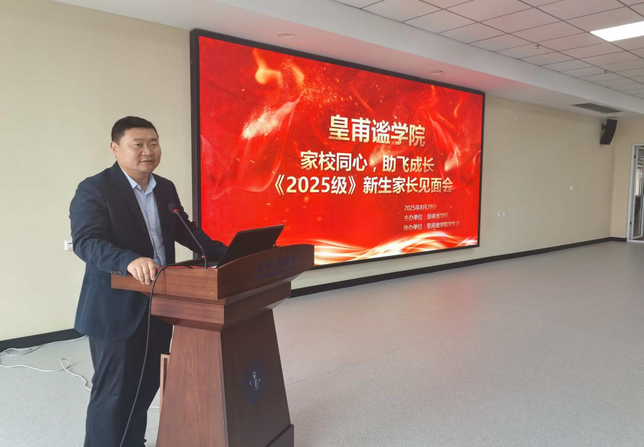 为搭建家校沟通桥梁,助力2025级新生更好开启大学生活。8月29日下午,皇甫谧学院在图书馆5楼一号报告厅隆重举行了举办了“家校同心,助飞成长”为主题的新生家长见面会。皇甫谧学院全体新生班主任,各教研室主任、专业负责人参加了本次会议,皇甫谧学院党总支书记王志江出席会议并致辞,副院长梁治学主持会议,共有100余名家长参加了本次见面会。