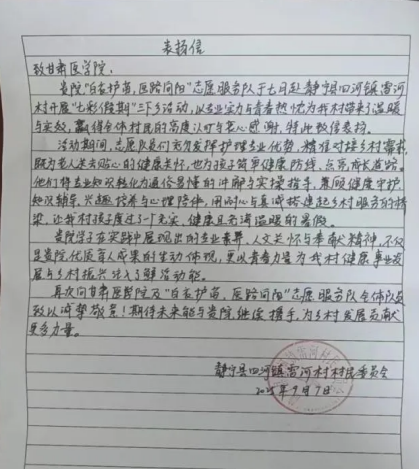 贵院“白衣护苗,医路向阳”志愿服务队于七月赴静宁县四河镇雷河村开展“七彩假期”三下乡活动,以专业实力与青春热忱为我村带来温暖与实效,赢得全体村民的高度认可与衷心感谢,特此致信表扬。