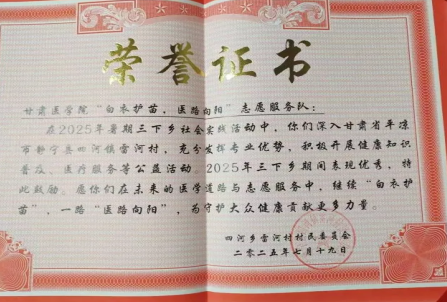 近日,甘肃医学院“白衣护苗,医路向阳”志愿服务队喜获静宁县四河镇雷河村村民委员会暑期“三下乡”表扬信,信中对我校护理学院学生在此次社会实践活动里的出色表现给予高度肯定,盛赞同学们凭借专业能力赋能基层、用实际行动传递温暖的青春风貌,认可了他们在实践过程中彰显出的专业素养、人文情怀与奉献精神。