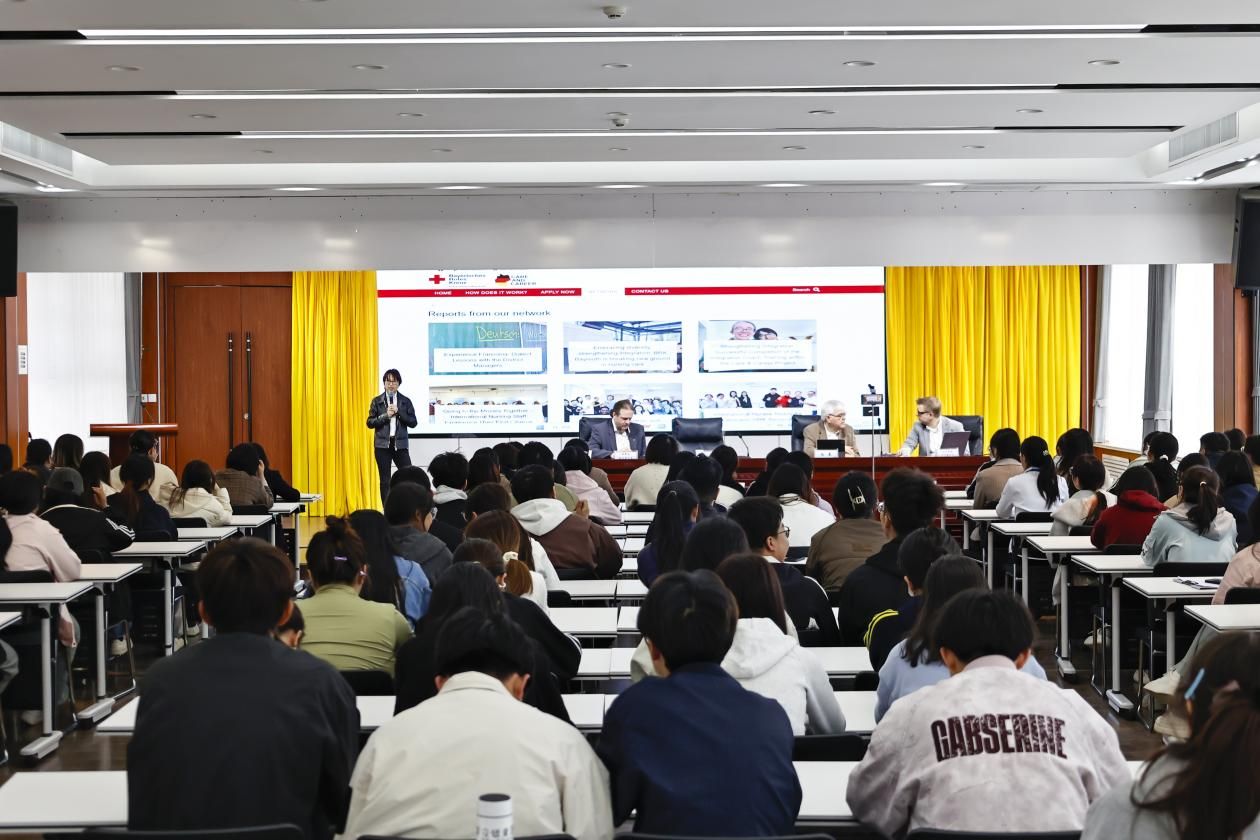 当日上午,分会总经理马尔库斯·卢克戴什尔、人力资源主任陈晨,共同为我校护理学院师生代表作了题为《德国养老护理现状》的主题讲座。讲座结合德国老龄化社会的背景,系统介绍了德国养老护理体系的结构特点、服务模式、人才培养标准以及红十字会在该领域发挥的重要作用。并从中德两国养老护理现状对比出发,围绕项目课程设置、赴德实习就业路径、跨文化适应等内容,向在场师生进行了详细的项目宣介。