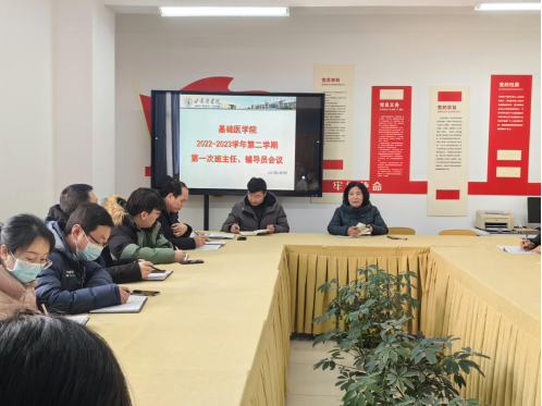 瑞雪迎春,卯兔送福,新学期欣然而至。为全力做好新学期开学工作,保障学院迎评促建工作稳步开展,基础医学院于2月9日召开基础医学院2022-2023学年第二学期第一次班主任、辅导员工作会议,学院党总支书记周凤娟、学生科长高泽谨、团总支书记石欣怡、学生科辅导员及全体班主任参加会议。