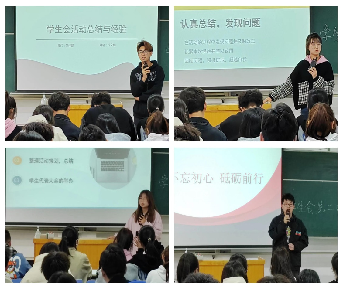 首先由学生会主席团成员对近期学生会活动进行评价总结,指出活动中存在的相关问题,他们将自身经验与实际活动相结合,从活动前期策划案的书写、活动过程中组织人员的调配和对特殊情况的处理,以及后期活动总结与新闻稿的撰写等方面给大家做了交流分享。倡导新一届学生会成员要明确定位,增强团队意识、标准意识,从集体中汲取力量,在活动中提升自我。