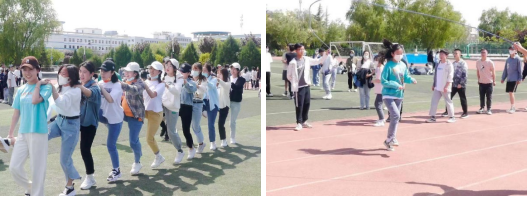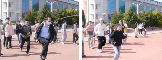 此次活动的主要项目是“集体跳绳”和“开火车”。各组以班为单位,一到操场便立即进入备战状态,大家热烈讨论、纷纷出谋划策,争分夺秒制定小组战术。伴着选手们整齐有力的口号声,“开火车”队伍浩浩荡荡蹦跳而来,观众的呐喊和欢呼声此起彼伏,青春的快乐在操场上尽情绽放;“集体跳绳”环节,参赛选手们身姿轻盈,灵动雀跃,翻飞的跳绳摇动着健身的欢畅,勃发的跳跃沸腾了生活的热望。比赛环节结束后,学生科老师们与此次活动的学生会工作人员共同体验了一场妙趣横生的集体跳绳。青春的热血在老师们体内沸腾,欢歌笑语萦绕整个操场!