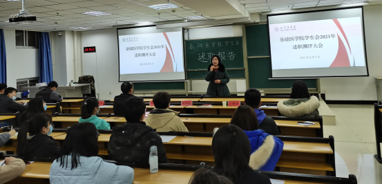 2021年12月31日晚,基础医学院学生会干部述职测评大会在二号教学楼B座第六大教室成功召开。基础医学院党总支书记周凤娟、学生科全体教师(辅导员)和2021级班团干部、学生代表及学生会全体成员参与了此次会议。
