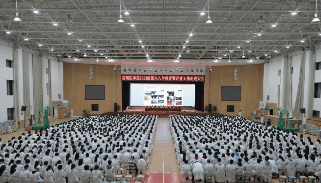 基础医学院学生科全体教师,2023级班主任、辅导员在主席台就坐,全院2023级新生参加大会。