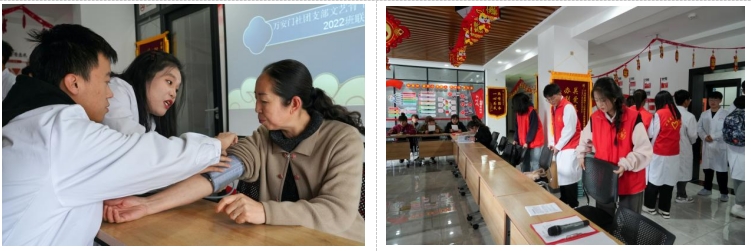 在志愿活动中,组织委员田建鑫现场为群众测量血压,并耐心讲解疾病预防及饮食方面的注意事项,其他同学在社区进行劳动实践服务。