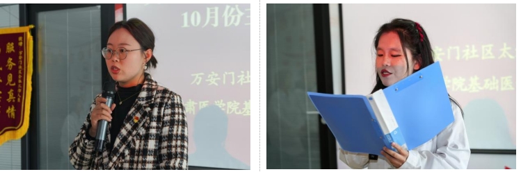 基础医学院团总支副书记王婉琦老师在听完兰书记授课后,结合自己的工作畅谈心得,寄语同学们在拥有理论的同时,需要实践的加持,鼓励同学们在实践活动中增长才干历练成长。团支书左雅茹代表同学们要向万安门社区的党员一样,走进人民心中,为老百姓解除病痛,真正履行医者“健康所系,性命相托”铮铮誓言。