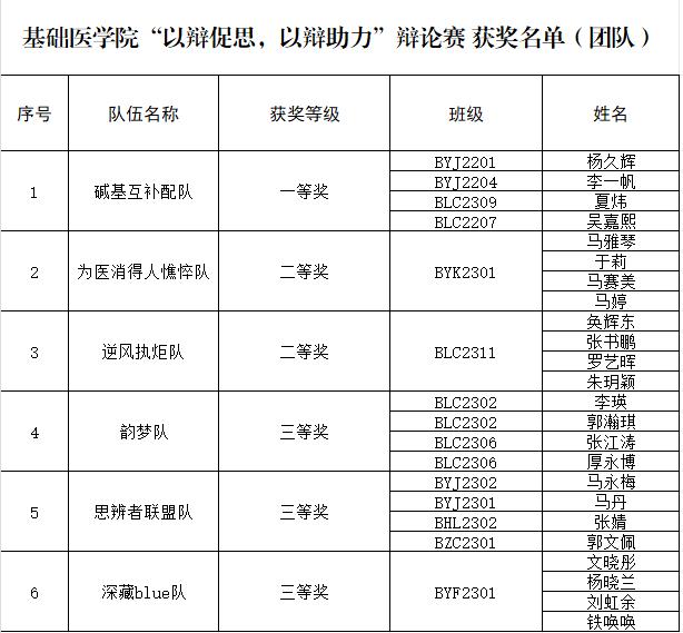 附件:基础医学院“以辩促思,以辩助力”辩论赛 获奖名单(团队)