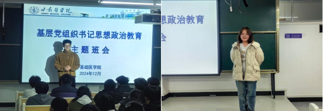 为充分发挥党建育人作用,加强对学生的思想政治引领,持续推动“时代新人铸魂工程”深入实施,基础医学院党总支书记雷世鑫,基础医学院副院长、教工党支部书记李红恩,学生党支部书记高泽谨经过集体备课,于12月6日、8日、20日、22日四个时间段,分赴各班召开思想政治教育主题班会。