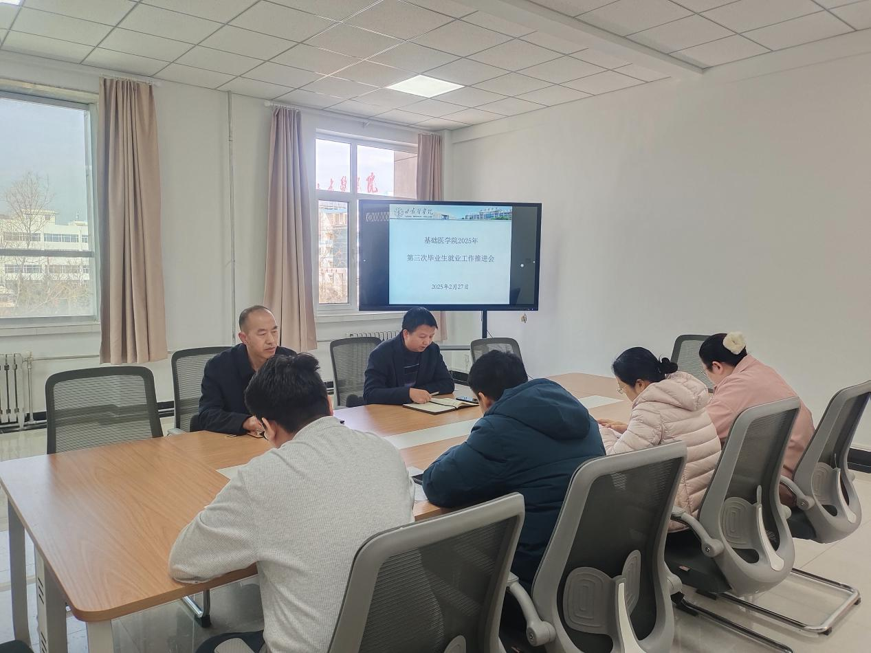 为贯彻落实甘肃医学院第五次就业工作推进会议精神,2025年2月27日,基础医学院召开就业工作推进会,会议由基础医学院党总支书记雷世鑫主持,基础医学院副院长李红恩,学生科负责人、毕业班班主任及就业专干参加了本次会议。
