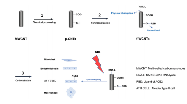 部分纳米材料是各种药物的靶向药物,在精密医学领域发挥着至关重要的作用。虽然纳米疫苗经常被报道,但实际上纳米材料仅作为载体或疫苗佐剂来提高疗效,但其潜力迄今尚未得到充分发挥。如何通过这种简单的方式,扩大病毒被消除的范围,从体表面和环境到身体的组织、器官、细胞?一种巧妙的设计是将改性纳米材料靶向到病毒感染的特定区域,这些纳米材料可以呈现由生物安全近红外光激发的光热转化效应,导致局部高温,最终消除病毒。最重要的是,这种设计应该通过特殊的偶联物来启动免疫反应,以上调或下调与细胞膜上的ACE2受体的竞争结合。根据碳纳米管的物理和化学性质,我们提出了一种通过光热转化进行酸化来促进这种响应。