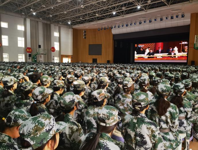 上午8时40分,师生已整齐就座,满怀崇敬与期待等待阅兵仪式开启;9 时整,阅兵式准时开始,45 个方(梯)队依次亮相,充分展现了我国强大的军事力量与国防实力。观看过程中,师生们全神贯注、神情肃穆,不时为受阅部队的飒爽英姿与国家的硬核实力报以热烈掌声,深刻感受到抗战胜利的伟大历史意义,也更加懂得如今和平生活的来之不易。