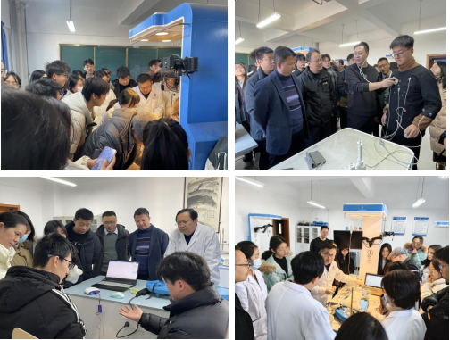 第一阶段报告结束后,参会人员前往一号实验楼机能学实验室,现场开展了第二阶段的机能学实验项目实践演示和观摩:智能化机能实验——失血性休克、AI 智慧一体式人体功能实验以及虚实结合智能穿戴式标准化病人系统等前沿项目,亲身感受了先进教学技术在医学教育中的创新应用,学科专业教师和学生均展现了极大的兴趣。