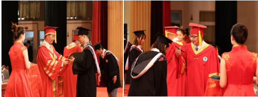 党委书记汪永锋为优秀毕业生颁发荣誉奖牌 校长王坤为毕业生代表拨苏正冠、颁发学位证书