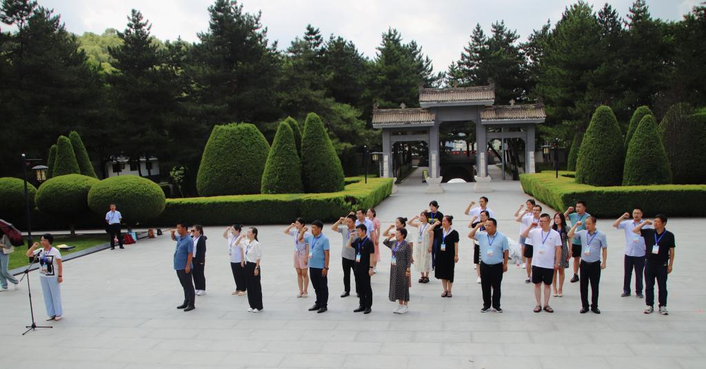 在庄严的南梁革命烈士纪念碑前,全体党员干部整队肃立,面对鲜红的党旗重温入党誓词。9个支部负责人向纪念碑敬献花篮,表达对革命英烈的深切缅怀和崇敬之情。