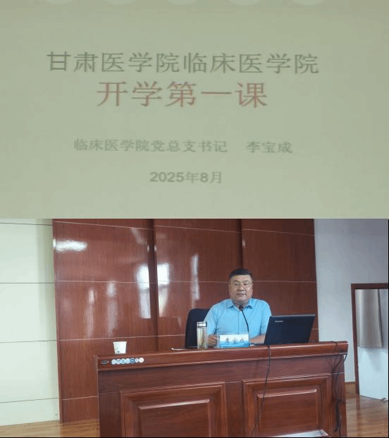 随后,李宝成同志以“逐梦医学路,启航新征程” 为主题,为新生讲授开学第一课。他从学校与学院的发展历程、学科优势等概况入手,深入开展思政教育,引导新生树立正确价值观。同时详细解读大学生工作指南,清晰介绍图书馆、实验室等学习资源与帮扶支持政策,并围绕专业发展、职业规划等方面为新生提供指导。针对专科新生,李宝成同志特别鼓励大家放下思想包袱,以自信姿态投入学习,精彩的讲授赢得现场阵阵掌声。